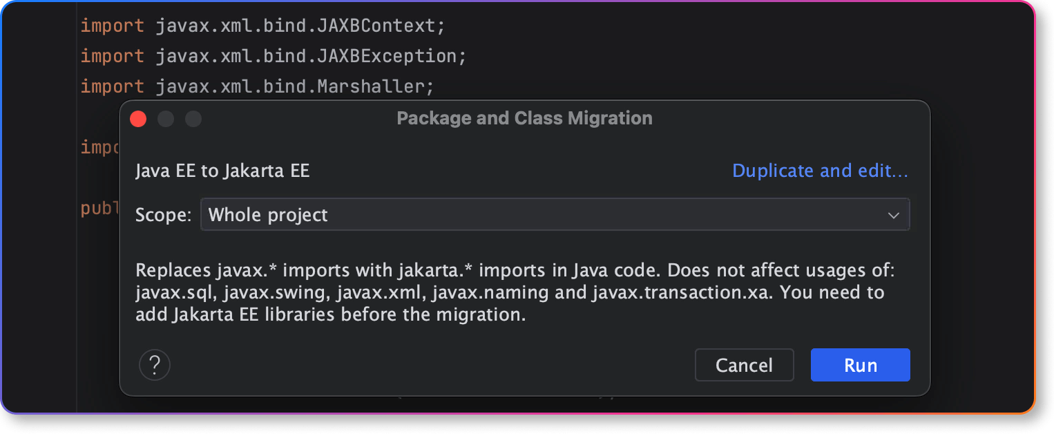 The Migrate... refactoring helps you quickly and painlessly migrate a project or module from Java EE to Jakarta EE. You can review all the discovered usages of Java EE imports on Refactoring Preview tab and finalize the process.