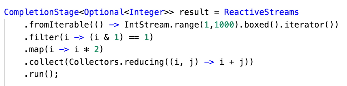 However, many MicroProfile enterprise application developers didn't want to or couldn't use third party dependencies but wanted (needed) to be able to manipulate reactive streams. So, in order to standardize the stream manipulation, MicroProfile Reactive Streams Operators was created to offer the equivalent functionality as java.util.stream. An example of the usage of Reactive Streams Operators is shown below.