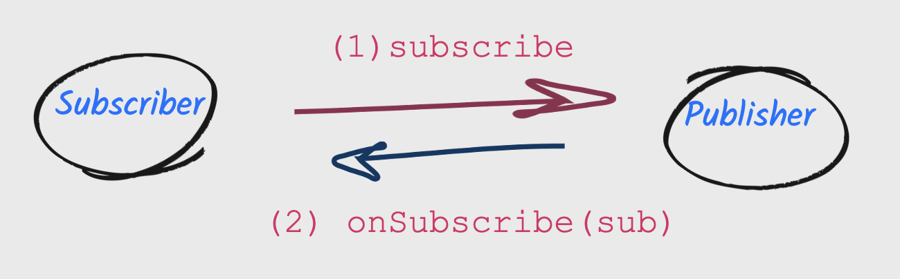 Subscriber and Publisher. The Subscriber is a stream Observer. A Subscriber subscribes to a Publisher via the method Publisher.subscribe(). Then the Publisher calls Subscriber.onSubscribe to pass over the Subscription, so that the Subscriber calls subscription.request(), which takes care of back pressure or subscription.cancel().