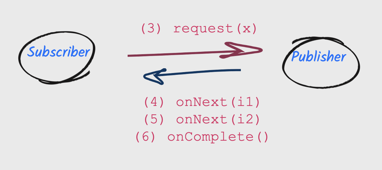 Subscription. If the subscriber is only capable of handling 4 items, it will pass its capacity via Subscription.request(4). The publisher will not send more than 4 unless the subscriber requests more. The Publisher invokes onNext() when an item is published or onComplete() if no item is to be published.