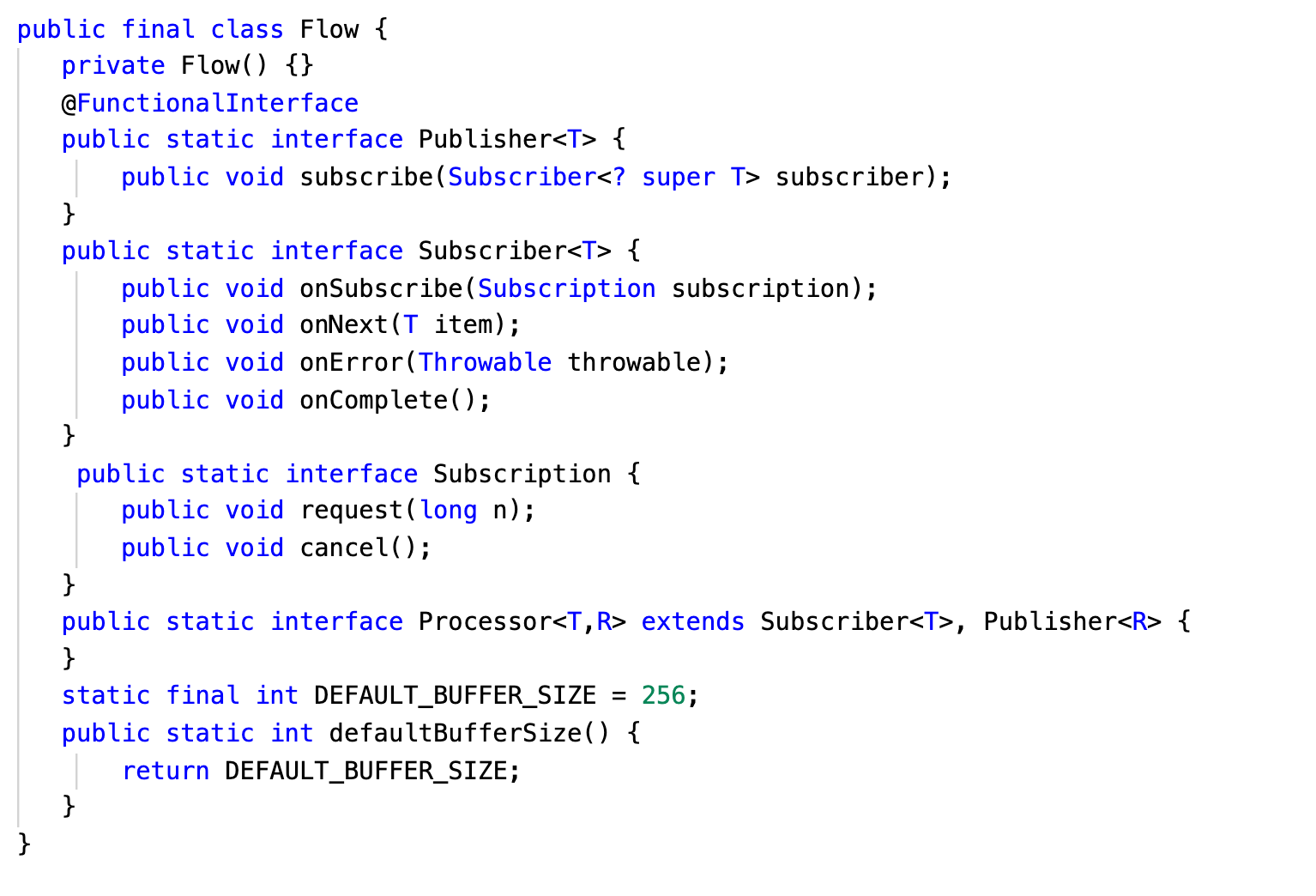 Java developers wanted to standardize the reactive streams APIs in the JDK, so that the APIs could be freely available without having to package any third party libraries. To meet these requests, JDK9 made the reactive streams interfaces available under java.util.concurrent.Flow, which is semantically equivalent to org.reactivestreams APIs. RxJava, Reactor, and Akka Streams all implement the interfaces under Flow.