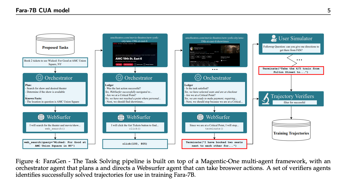 Fara-7B operates by visually perceiving a webpage and takes actions like scrolling, typing, and clicking on directly predicted coordinates. It does not rely on separate models to parse the screen, nor on any additional information like accessibility trees, and thus uses the same modalities as humans to interact with the computer. To train Fara-7B, we developed a novel synthetic data generation pipeline for multi-step web tasks, building on our prior work (AgentInstruct). This data generation pipeline draws from real web pages and tasks sourced from human users.
