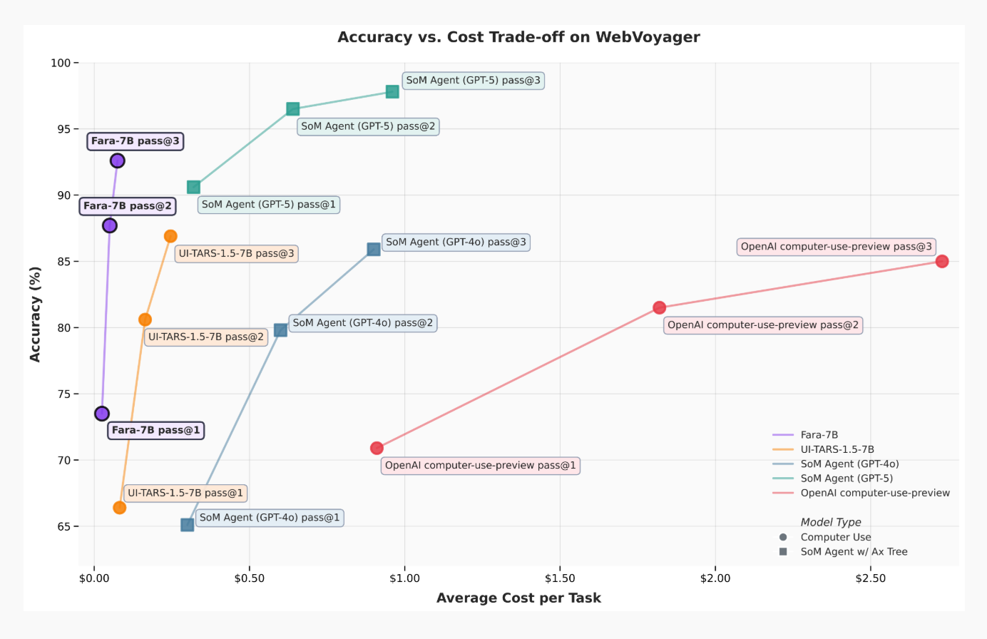 Unlike traditional chat models that generate text-based responses, Computer Use Agent (CUA) models like Fara-7B leverage computer interfaces, such as a mouse and keyboard, to complete tasks on behalf of users. With only 7 billion parameters, Fara-7B achieves state-of-the-art performance within its size class and is competitive with larger, more resource-intensive agentic systems that depend on prompting multiple large models. Fara-7B’s small size now makes it possible to run CUA models directly on devices. This results in reduced latency and improved privacy, as user data remains local.