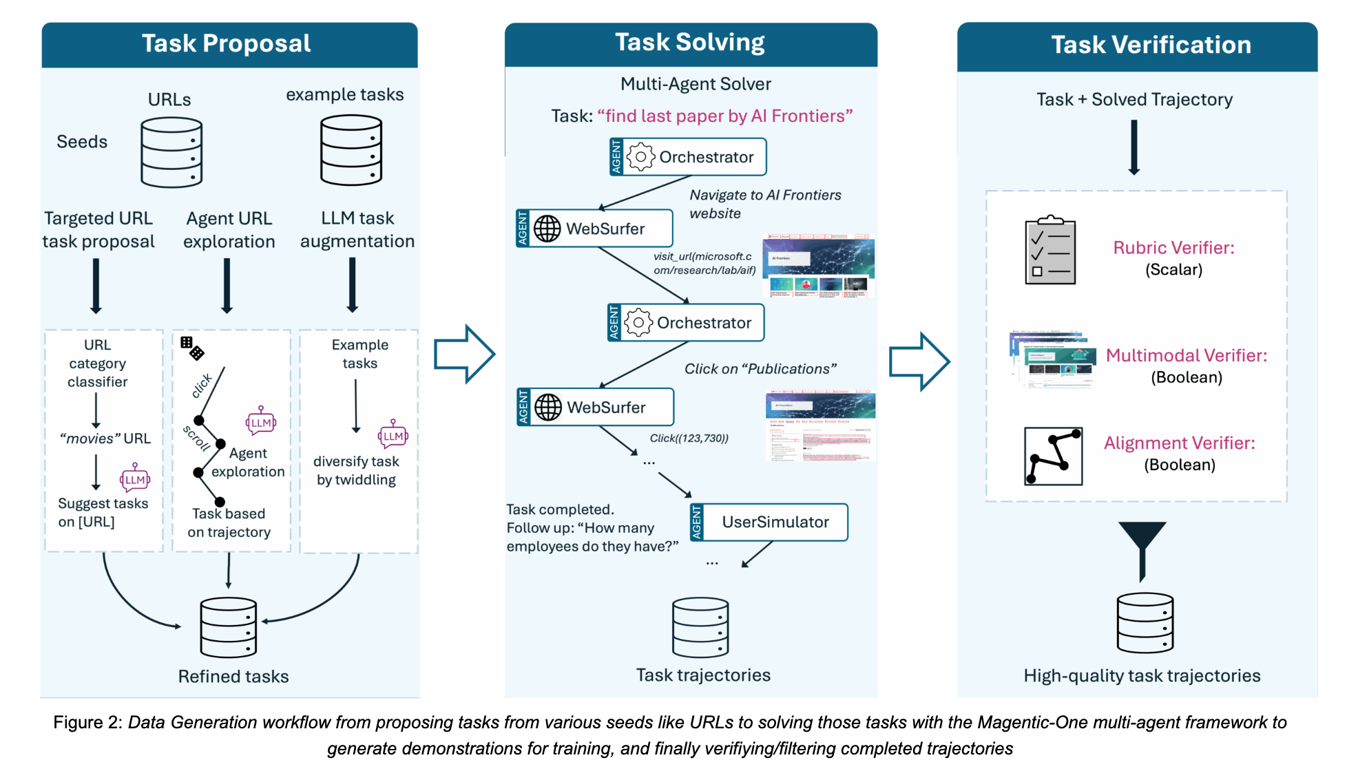 Task Solving. Once synthetic tasks are generated, a multi-agent system built on Magentic-One attempts to complete them to generate demonstrations for supervised finetuning. The multi-agent system uses an Orchestrator agent to create a plan and direct a WebSurfer agent to take browser actions and reports results. The Orchestrator monitors progress, updating plans as needed, and can end tasks or engage a UserSimulator agent if user input is required, allowing for multi-turn completion. Each task and corresponding sequence of observations, actions, and agent thoughts forms a “trajectory”.