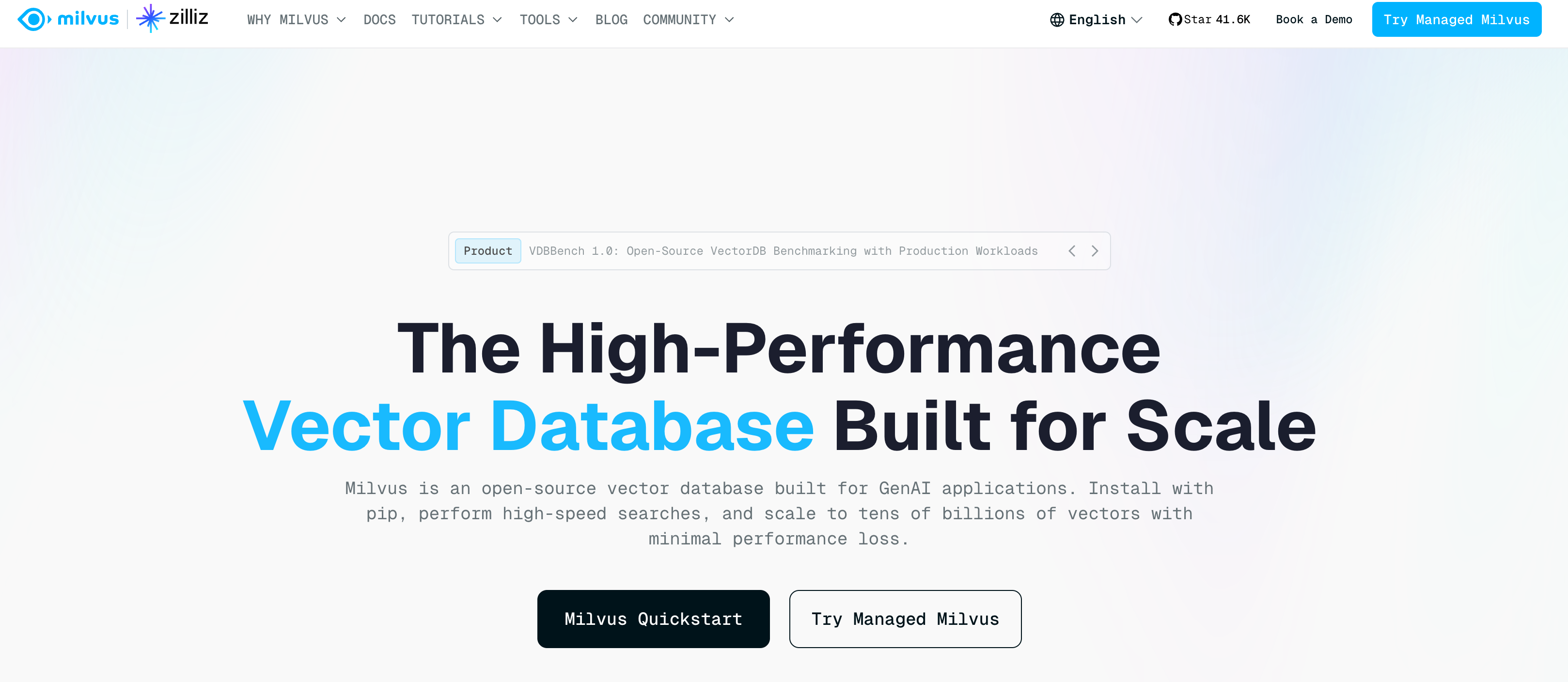 Milvus is an open-source vector database developed by Zilliz. Milvus is known for providing scalable storage for large amounts of vector embeddings and supporting high-performance similarity searches of vector data.