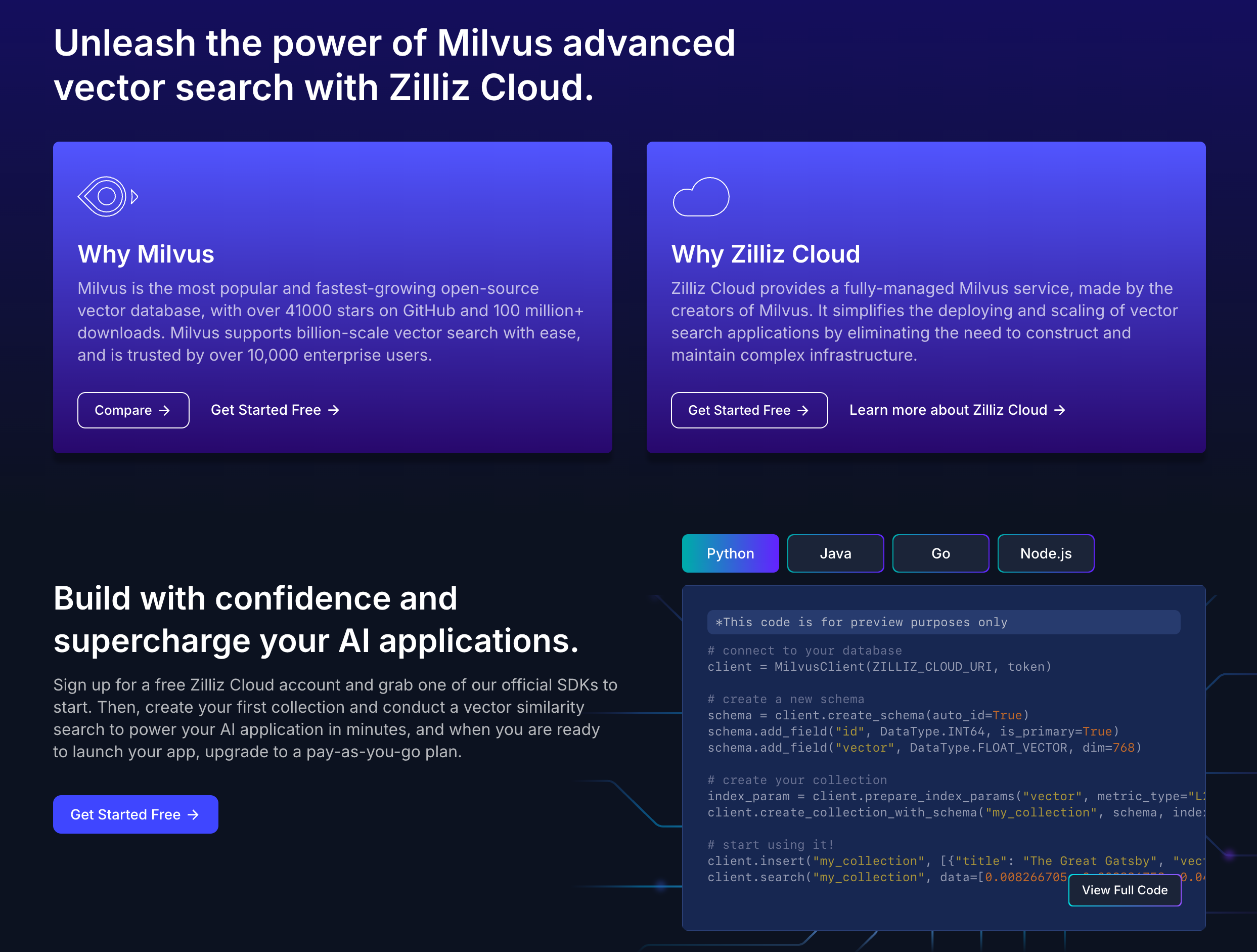 Milvus offers numerous software development kits (SDKs) to support development in various languages, including Python (pymilvus), Java and Go.