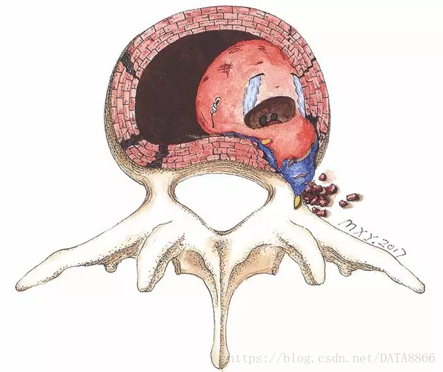 因为这种旋转力,对于腰间盘的打击是毁灭性的,腰间盘被逼得走投无路,只能朝着之前纤维环破裂的口子挤了出去。