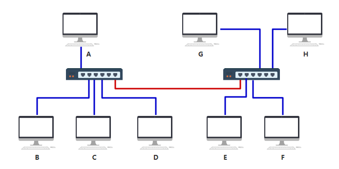 于是你们发明了一个中间设备,你们将网线都插到这个设备上,由这个设备做转发,就可以彼此之间通信了,本质上和原来一样,只不过网口的数量和网线的数量减少了,不再那么混乱。