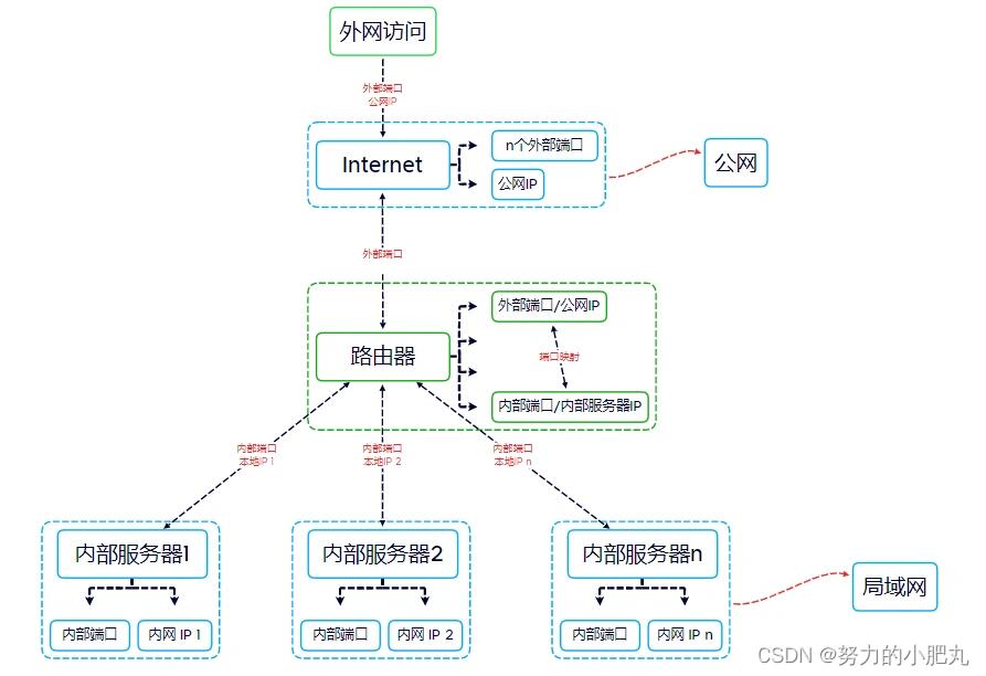 像百度,淘宝,华为这些它们的服务器都架设在公网上,只要拿到他们的IP地址就可以任意访问,但我们的设备是在内网上的,内网、外网一开始并不知道相互的IP地址,都要拿到相互的IP地址才能互相访问,这时候路由器的作用就是充当内网与外网的"中介",转发内网、外网的IP地址和数据,让内网与外网互通。