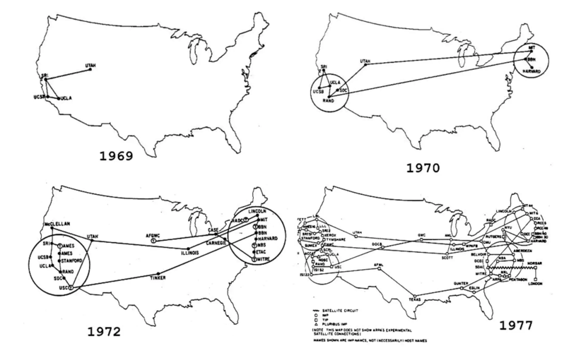 为了扭转这一局面,美国国防部于 1969 年 研究一种 “分布式” 的指挥系统 ARPANET(阿帕网)。它由无数的节点组成,当若干节点被摧毁后,其它节点仍能相互通信。 这便是最早网络的诞生。