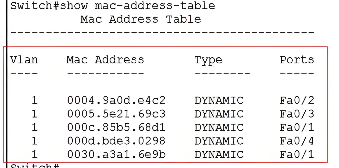 交换机内部维护一张 MAC 地址表,记录着每一个 MAC 地址的设备,连接在其哪一个端口上。