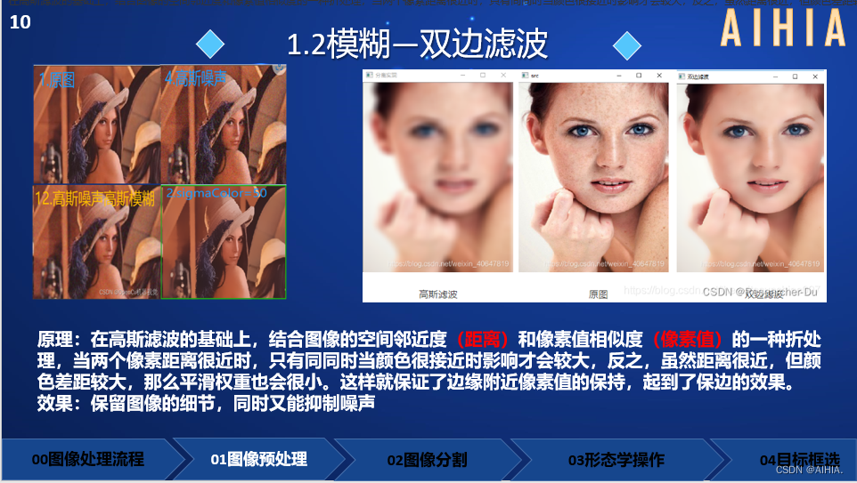 1) 前面三种滤波在去除噪声对图像影响的同时,也会弱化边缘信息,因此这里也简单提到双边滤波,双边滤波即边缘保留滤波,既能模糊图像,降低噪声的影响的同时,也能保留边缘信息。’