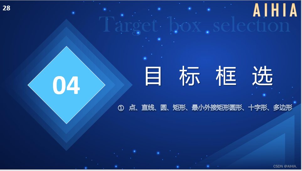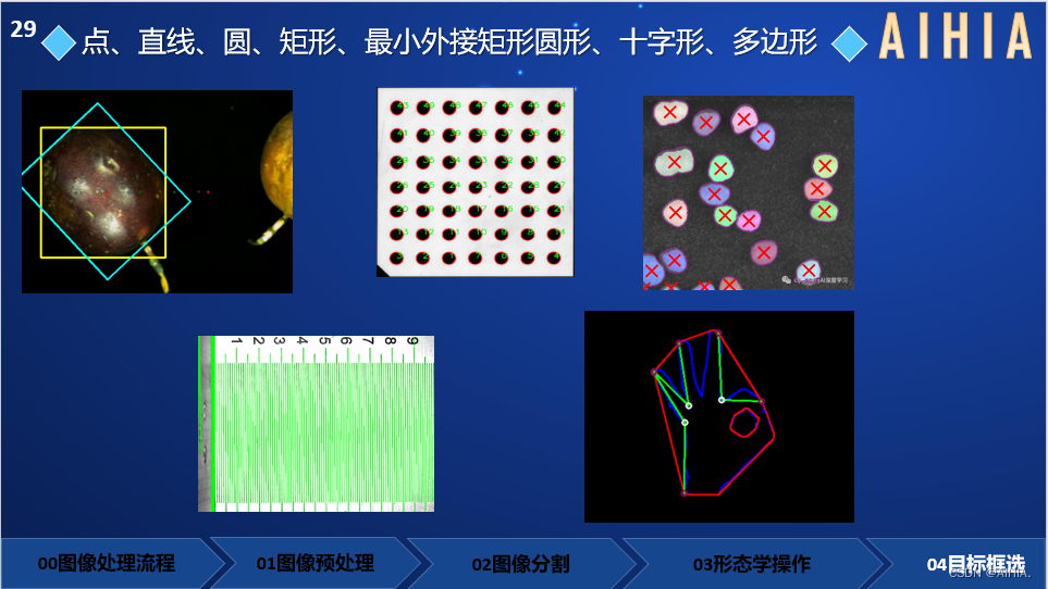 对目标的框选显示上,可以用点对轮廓质心进行显示,也可以通过轮廓、或者霍夫直线、霍夫圆进行检测、也有正接矩形、最小外接矩形、十字形多边形显示。