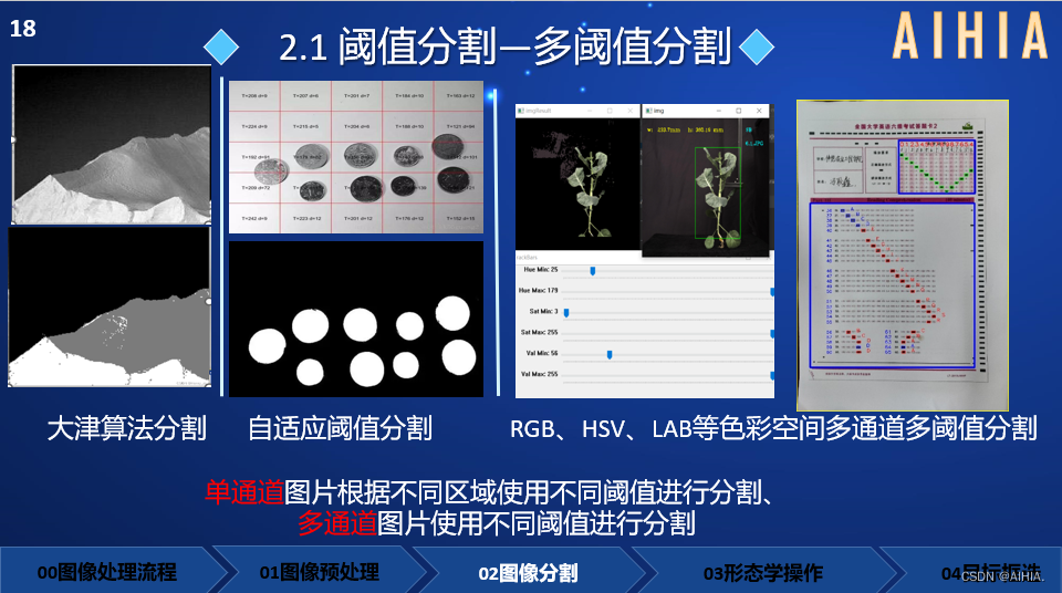 2) 对于单通道多阈值分割,这里介绍大津算法、自适应阈值分割算法。大津算法又称最大类间差法,原理是将灰度值分为多个阈值,对每个阈值进行组合,将图像分割为若干类,根据每一类的像素数和平均灰度值,求得该阈值下的类间方差,当该类间方差越大时,表明分割效果越佳。