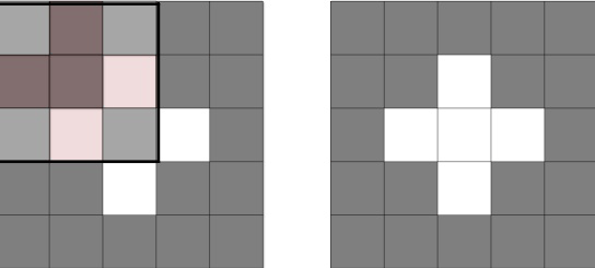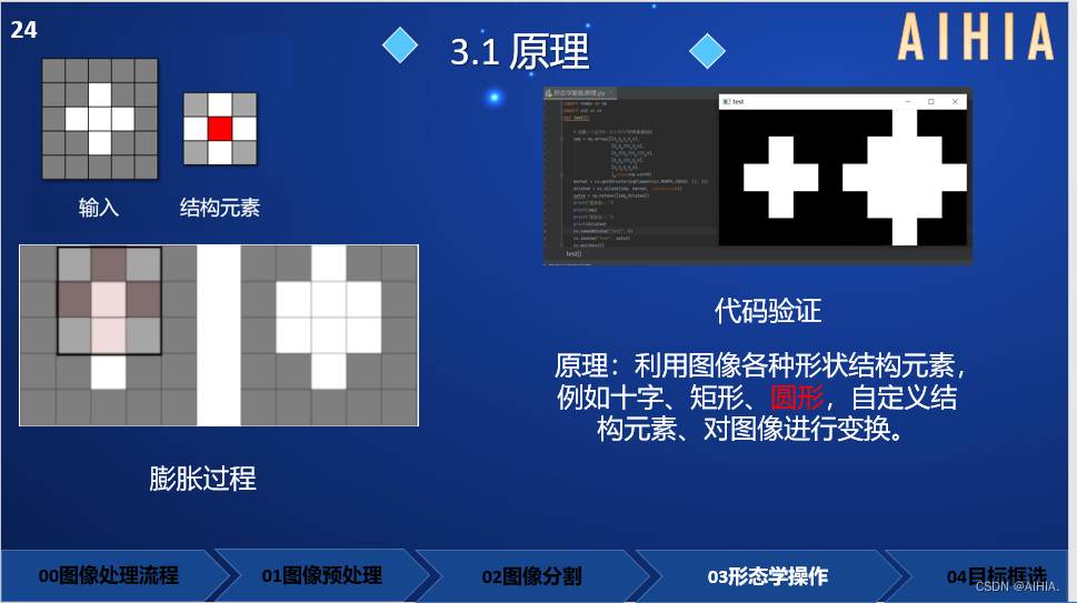1) 为了方便大家快速理解形态学操作的原理,这里制作了一个动画,其原理与前面的滤波操作相同,结构元素在输入图像中进行滑动遍历,当结构元素中心点与输入图像的白色像素点重合时,与结构元素白色像素重合的像素点将会变为白色。大家可以观看动画。