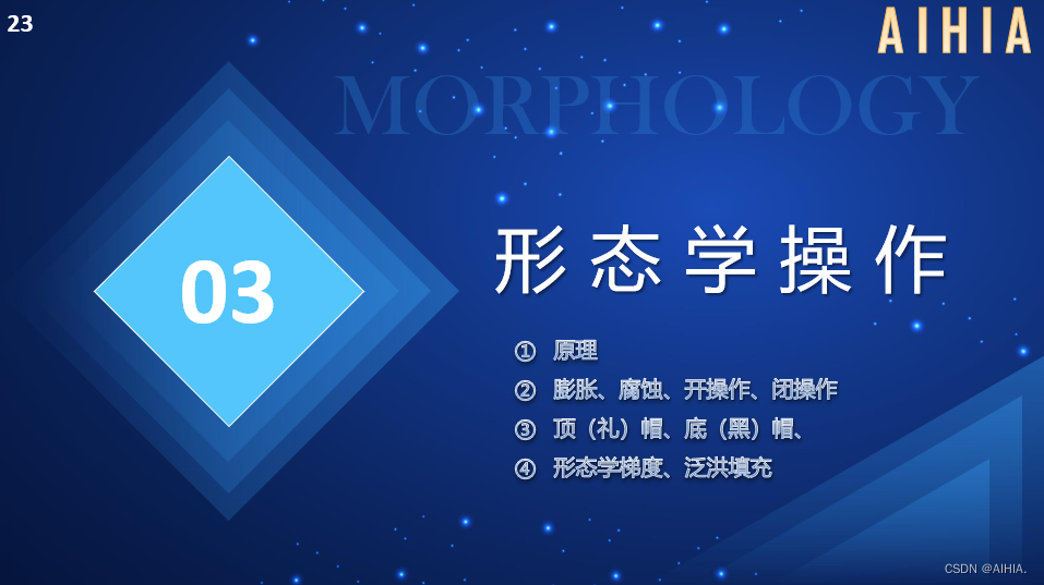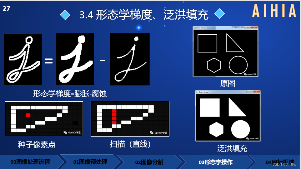 - 形态学操作主要包括膨胀、腐蚀、开、闭操作、顶、底帽、形态学梯度,泛洪填充等操作。
