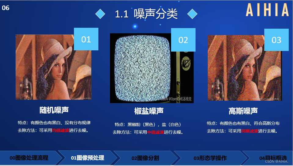 图像预处理,主要包括图像增强和一些灰度化、归一化、尺度变换、剪裁、图像平移、旋转等操作。本次预处理主要分享的内容是图像增强部分,图像增强目的就是优化图像质量,方便后续算法处理。下面将从噪声分类、如何去噪声以及锐化边缘、以及图像光照不均匀时,如何调整。