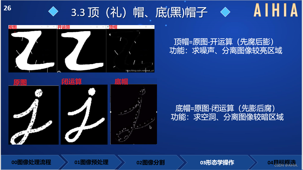 对于顶帽,底帽,其实也是二值化图像之间减法运算。顶帽是原图减去开运算,可以求得噪声,或者图像较亮的区域。底帽则色原图减去闭运算,可以求出空洞,分离图像较暗区域。