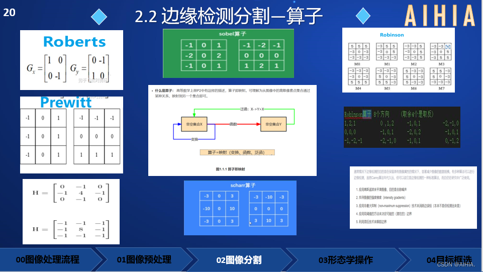 - 这里展示的是各种边缘检测算子模板,具体原理以及相对应的优缺点,这里不做过多的赘述。
