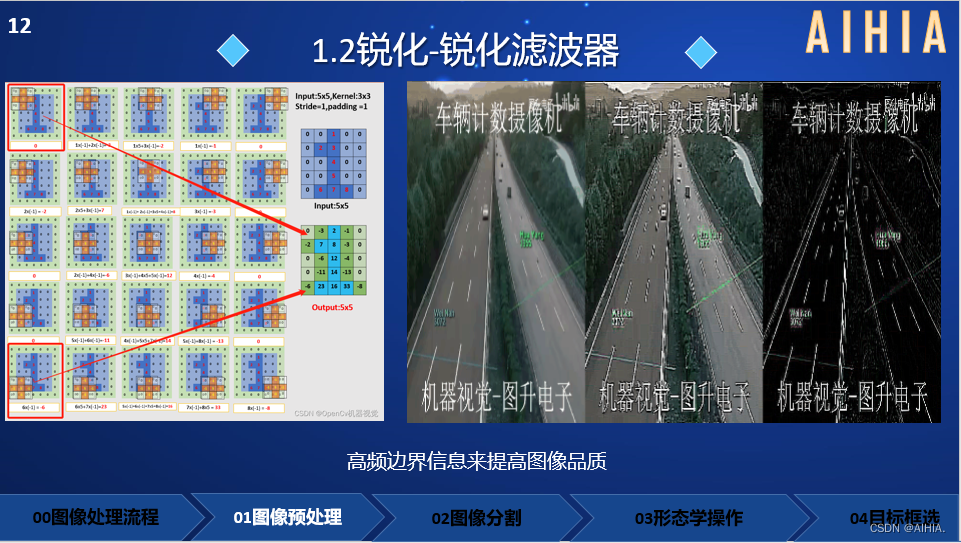 2) 其原理是增强图像中高频信息,使得图像细节更加清晰。所谓的高频信息是指图像中快速变化的部分,图边缘、角等。通过锐化滤波,在图像中滑动,最后输出锐化图像。