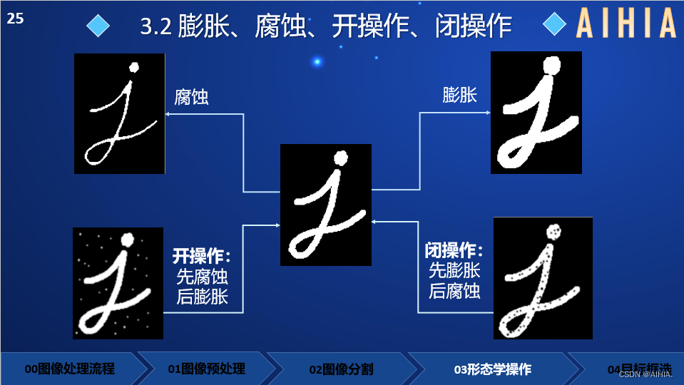 2)开操作,就是先腐蚀,再进行膨胀,可有效消除一些白色噪点。闭操作则是相反,先膨胀再腐蚀,可以有效填补空洞。