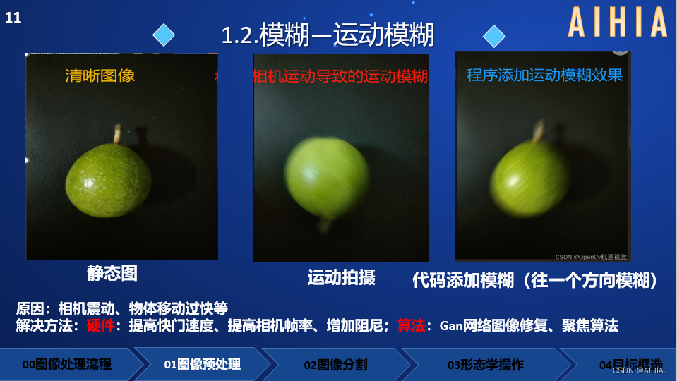 1) 前面滤波主要是为了降低噪声对图像质量的影响认为引入滤波模糊,下面介绍的运动模糊,是因为相机快门速度慢或者物体移动速度快,以及在拍摄过程中发生震动或者移动,导致捕捉到的图像发生轻微位移,从而造成图像往一个方向模糊。