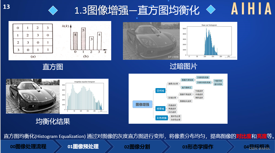 1) 图像预处理当中,除了对去噪模糊、边缘锐化,因为我们获取到得图像有时候会因为光照不均匀,导致图像过量或者过暗,所以往往需要对图像进行均衡化,调整图像整体得亮度和对比度。这里以直方图均衡化为例子。