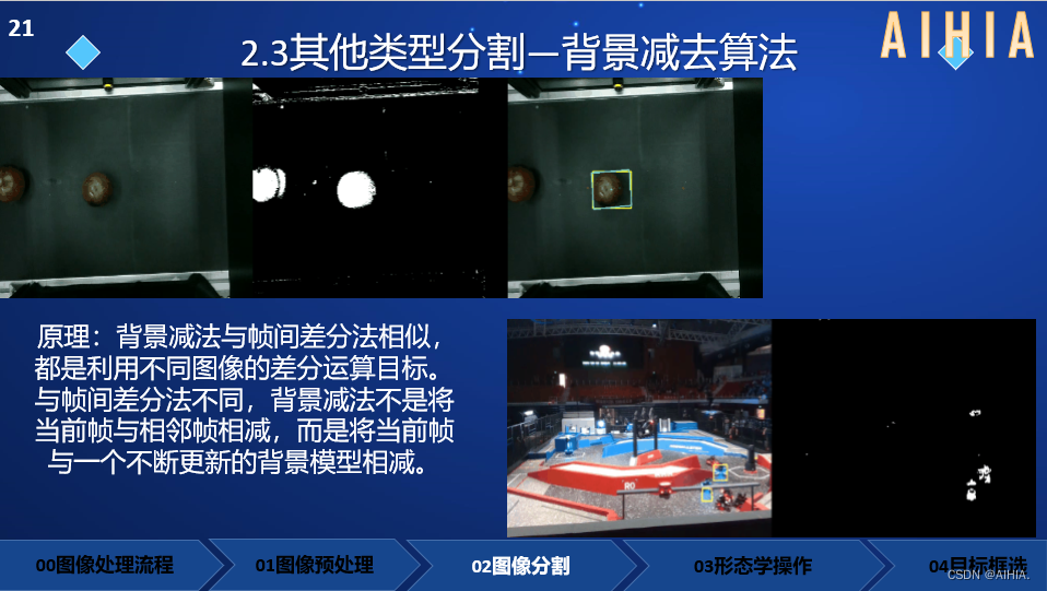 除了以上经典的分割方法,其是还有一张对运动物体分割效果较为良好的—背景减去算法。第一个动图是百香果分拣机上的百香果识别,第二个动图是机甲大师雷达站上对敌方车辆识别检测的应用。由于时间有限,后面我将加速分享江都,具体原理后面大家私下一起探讨。