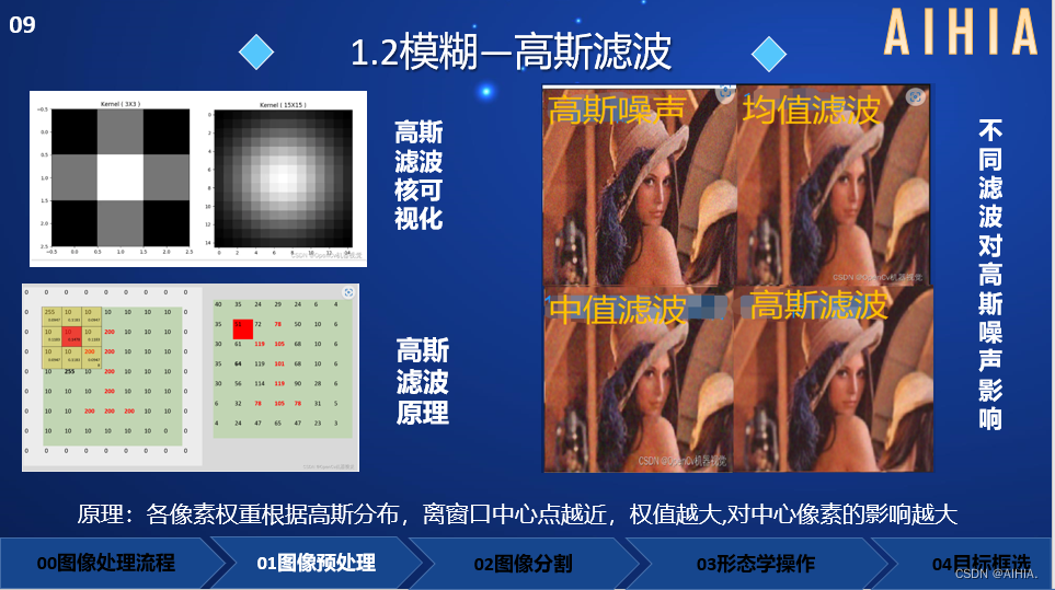1) 第三种即为高斯滤波,其原理是各像素权重根据高斯分布,离窗口中心点越近,全职越大,对中心像素的影响越大。
