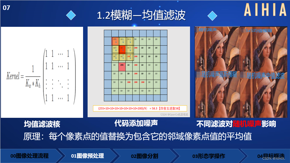 1) 首先是均值滤波,其原理是将每个像素点的值,替换为包含它的领域像素点值的平均值。