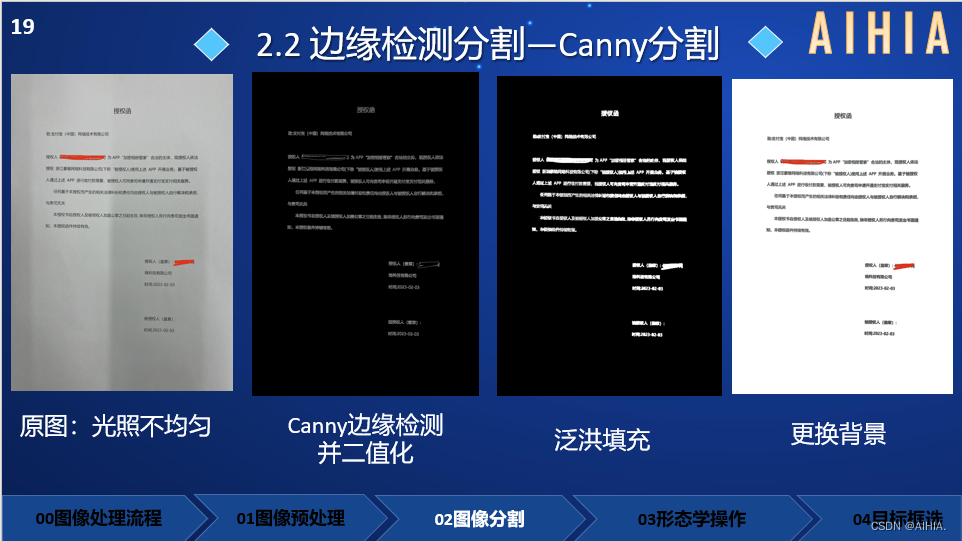 2) 这里举了一个例子,在光照稍微不均匀的情况下,如何将文本信息进行分割换背景。如果从阈值分割来解决,效果不是那么好,但是使用Canny边缘检测算法,就可以避免光照不均匀的影响,直接检测轮廓,对其进行形态学操作以及填充,再进行掩膜运算,即可实现换底功能。