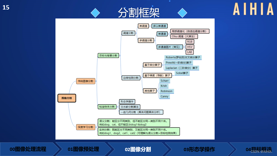 2) 对于前后景的分割,又分为阈值分割还有边缘检测分割。其中阈值分割可细分单阈值分割与多阈值分割。边缘检测分割则主要根据微分、梯度等相关算子,对图像进行滤波,从而获取图像的轮廓。