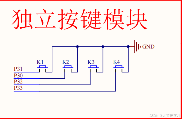 这涉及到单片机引脚的功能(有兴趣的自己查阅资料学习笔记之-51单片机IO口详解-CSDN博客)51单片机有四组I/O引脚P0\P1\P2\P3,都可以独立控制,既可以做输入也可以做输出,在我们常用的开发板上已经将四个独立按键与P31、P30、P32、P33连接在一起了。