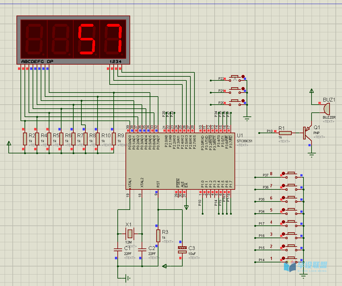 本系统以AT89C51单片机为核心控制器,通过外围接口电路实现八路抢答功能。系统采用定时器/计数器进行计时,确保时间的准确性。同时,利用数码管显示时间,方便参赛者和观众了解剩余时间。系统还具备声音提示功能,当选手有效抢答时,扬声器会发出提示音。