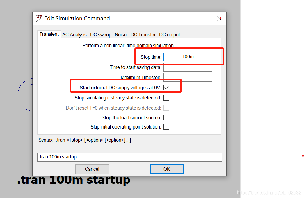 进行仿真,在原理图空白处单击邮件,点击Run,开始设置仿真条件,停止时间我们设为100ms,勾选起始电压为0V。然后点击OK。