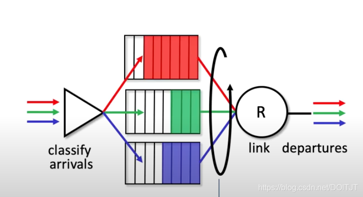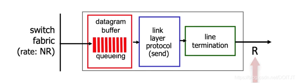 - Blocking Switch Fabric: Packets occasionally need to wait at input port to be forwarded to the other side, less costly, cause input port queuing.