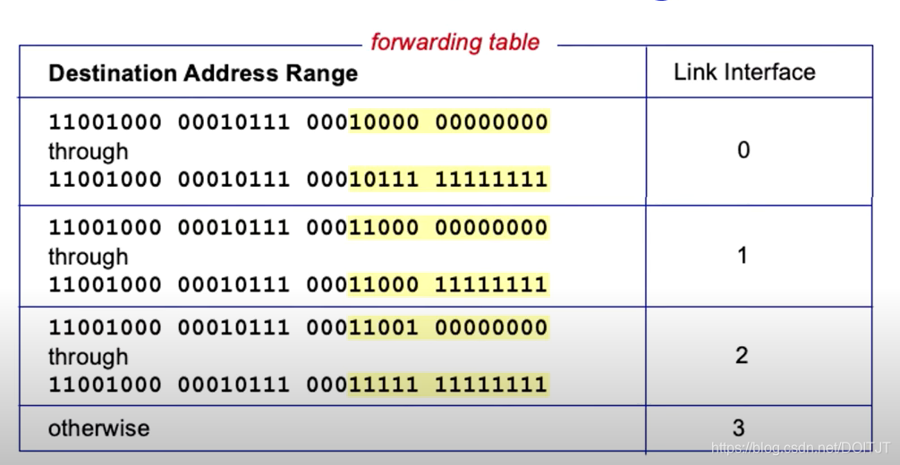 Destination Address are arranged by prefix and paired with different output ports (link interfaces).