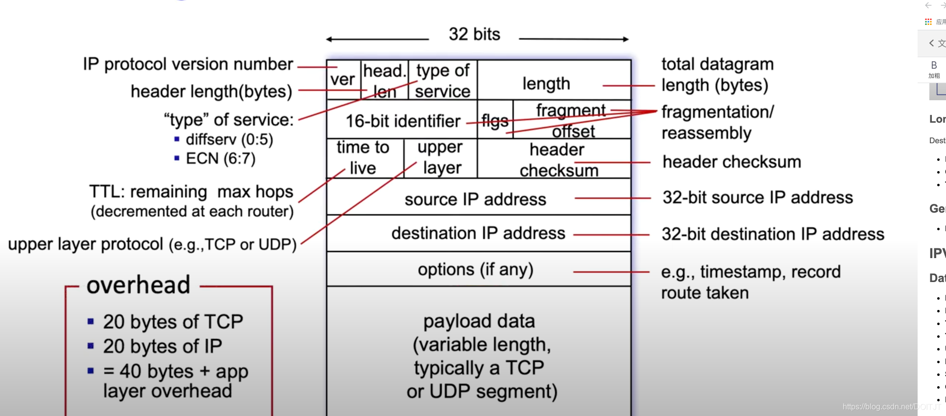- Type of Service: Identify datagram service type -- e.g. ECN (2 bits, router sets the ECN to indicate congestion), diffserv (remaining 6 bits)