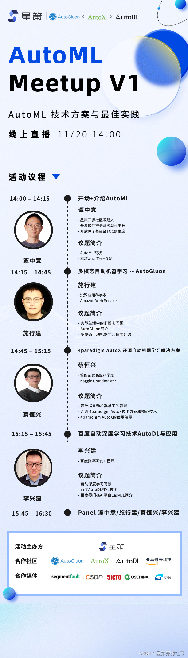 2022年11月20日14:00,由星策社区主办的第一期 AutoML Meetup 将通过线上直播开展, 活动特邀自动机器学习(AutoML)领域的优秀开源项目负责人、架构师共同探讨自动机器学习技术方案与最佳实践。