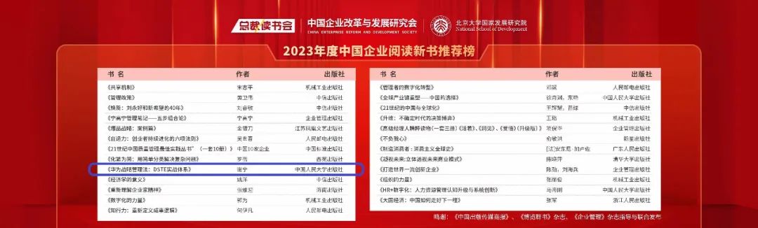 2、谢宁老师专著《华为战略管理法:DSTE实战体系》荣幸入选本届中国企业领袖读享盛典“2023年度中国企业阅读新书推荐榜”。