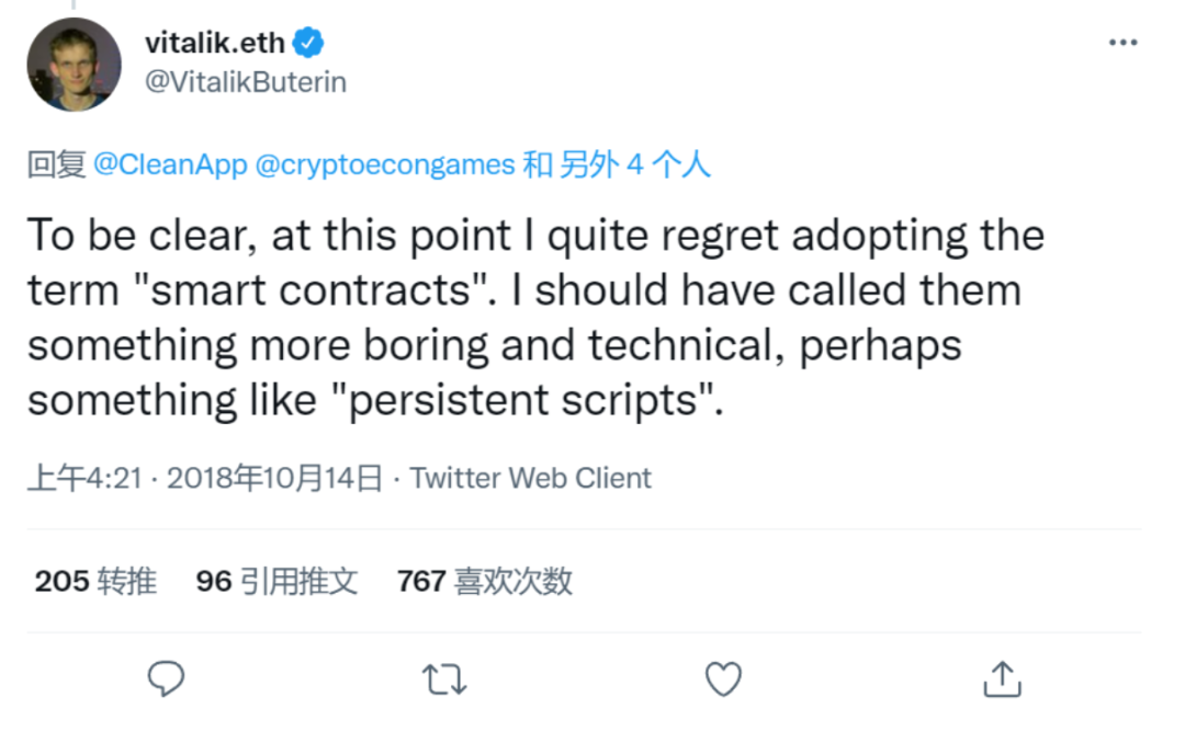 Vitalik Buterin 曾经在 2018 年的一条推文里说,自己很后悔使用“智能合约”这个名字,而是应该起一个更枯燥和技术性的名字,比如 “持久脚本(persistent script)”。结合上下文来看,他的本意是说,由于“智能合约”这个名字高端大气上档次,引来了太多的政经法学专家的浮想联翩,导致各种诸如代码即法律、密码法条之类的讨论,超过了技术本身的能力范围。