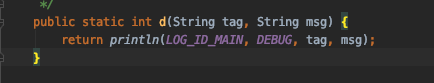 这个包里面就会有Log类,而我们进入到d的声明里面,发现“d”是一个static类型,返回值类型为int,需要两个String类型参数的函数。