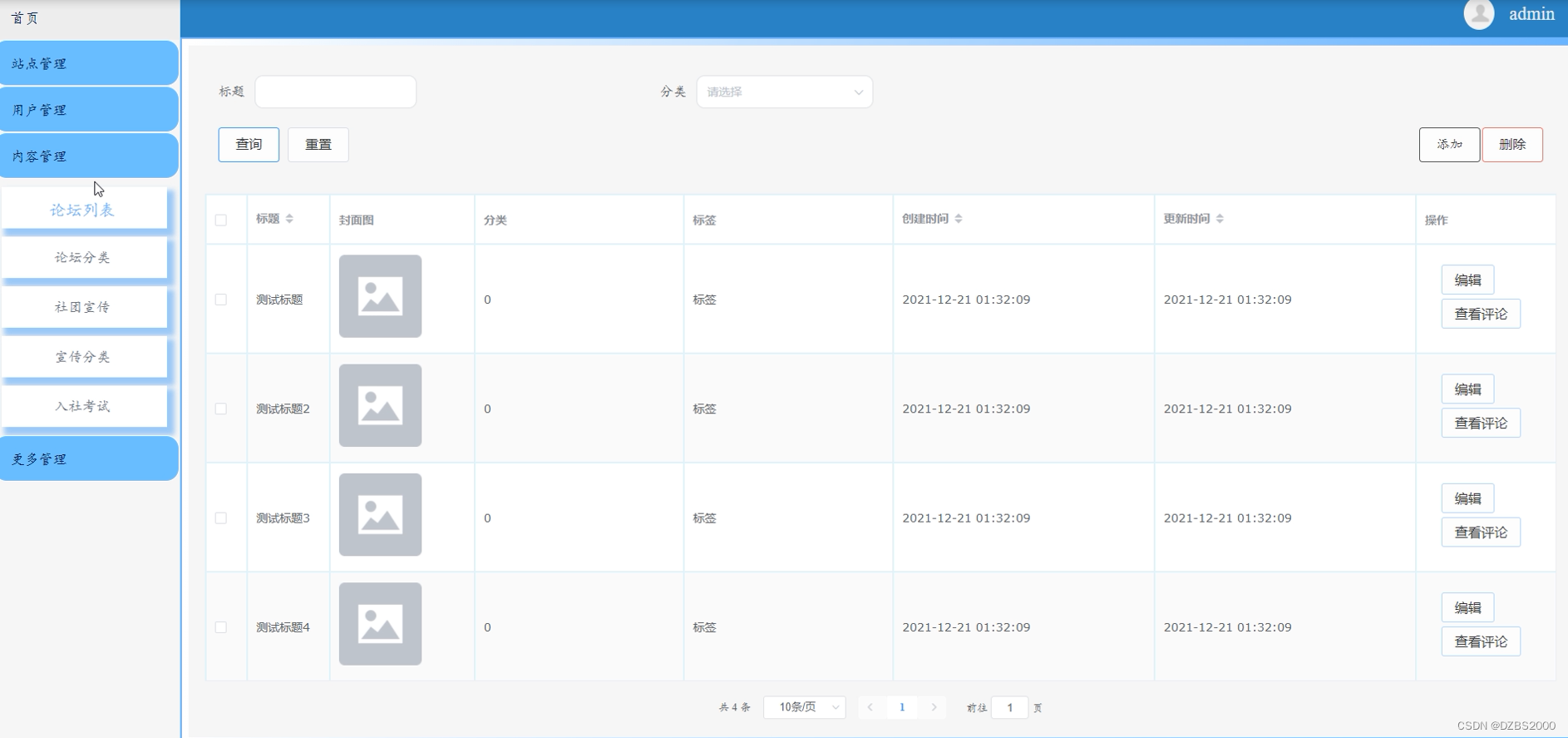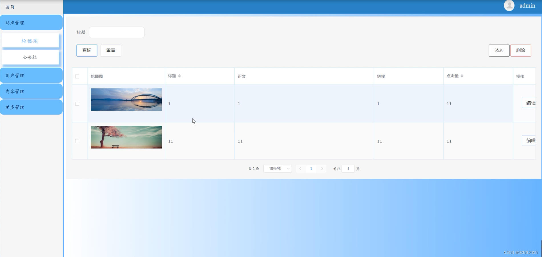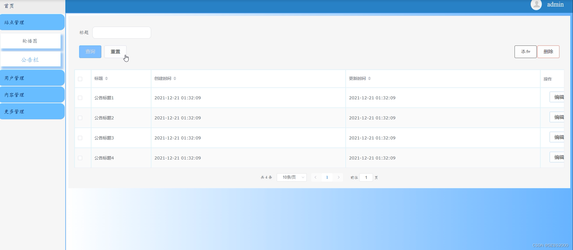 站点管理模块:查询标题的增加、删除、修改等功能。