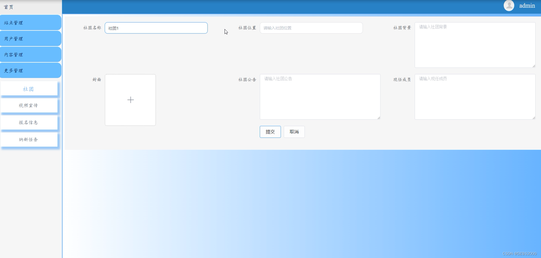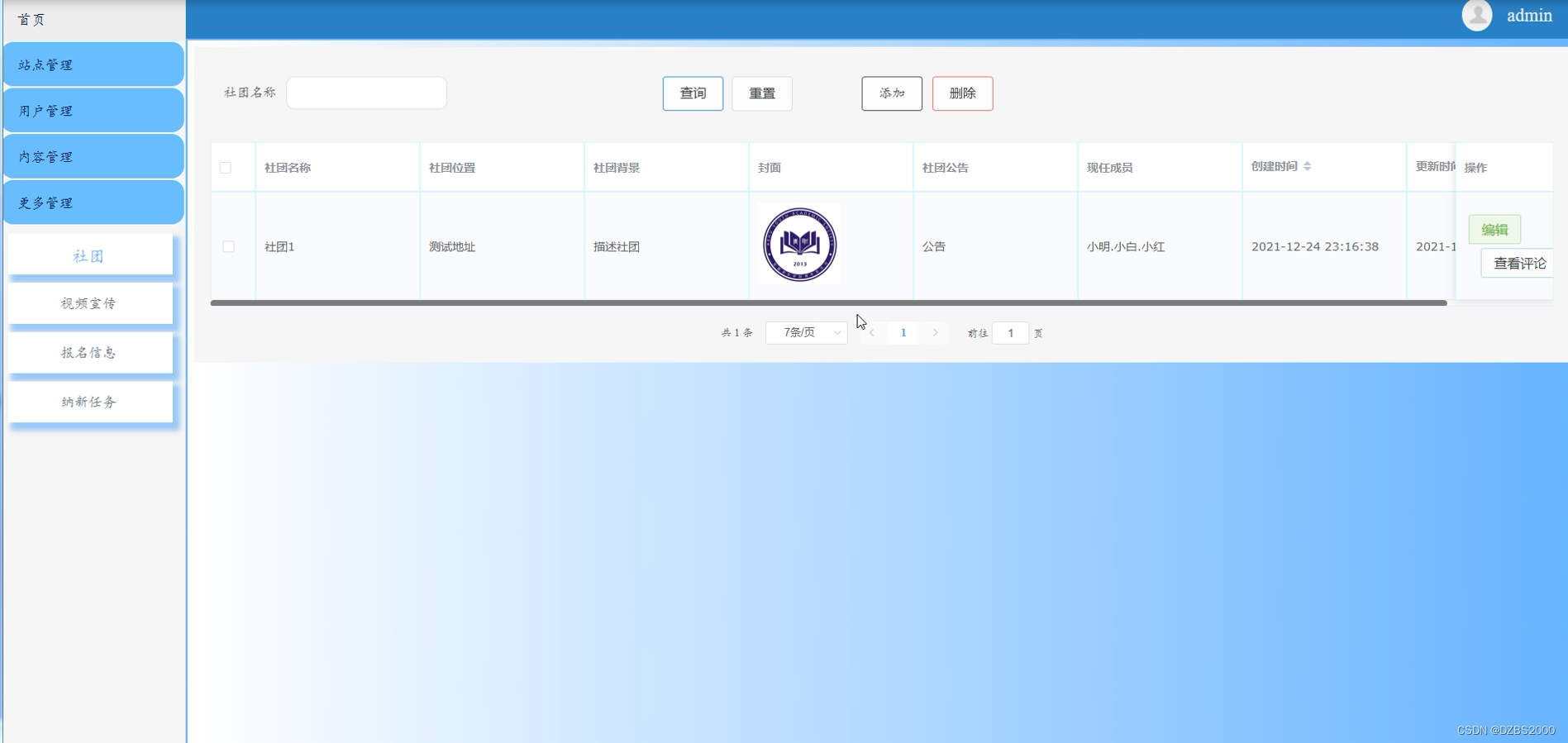 管理员发布新的社团宣传信息,系统显示社团宣传信息,社团信息添加功能主要指对其标题、封面图、文章分类、点击数、来源、标签等一些基本信息的添加、删除和修改。社团宣传能根据多种条件对社团信息进行查询。