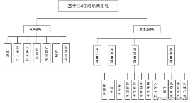 根据对系统的功能进行分析可以总结在线纳新系统的具体功能模块包括下面的几个主要的功能模块:该系统主要从两大模块进行设计的,首先就是用户参与操作需要的模块,此外还需要有管理员用到的模块,两者之间不是互相独立的,他们之间有着密切的联系,同数据库表中的数据连接起来进行操作。每个模块访问相同的数据库,但访问的表不同。系统的各个功能模块是根据所收集的资料研究得到的。在以上分析功能的基础上,系统模块分为多个模块。用户含有的功能有注册,登录,社团、社团宣传、社团查询、视频宣传等,退出登录等功能,管理员含有的功能有修改密码,用户管理、纳新任务管理、社团宣传、视频宣传管理、宣传分类管理、入社考试管理、报名信息等功能。