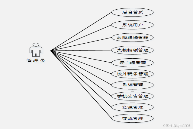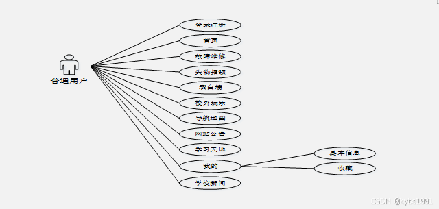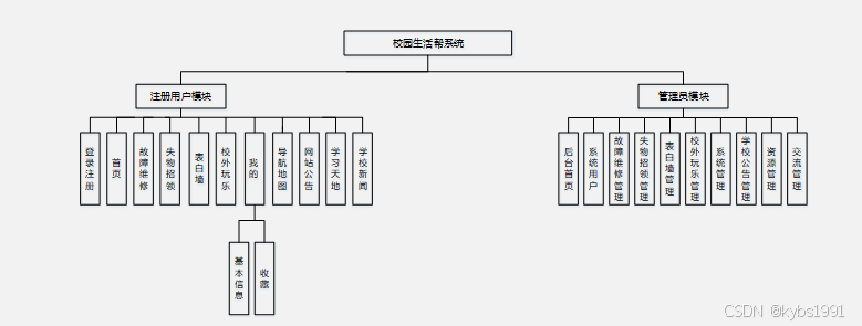 通过校园生活帮系统,支持用户的登录,还支持对用户的信息、故障维修、失物招领、表白墙、校外玩乐、导航地图、网站公告、学习天地、学校新闻的查看,并且提交全面的数据和信息,从而满足用户的各种需求。根据系统功能需求建立的模块关系图如下图: