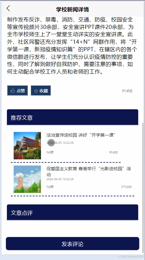 用户点击“学校新闻”,可以查看学校相关的新闻和资讯,了解校园动态,可以进行点赞、收藏、评论等操作。界面如下图所示。