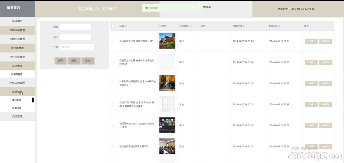 管理员点击“资源管理”这个菜单,可以管理系统中的学校新闻资讯和学校新闻信息的分类,方便学生浏览和查找。资源管理界面如下图所示。