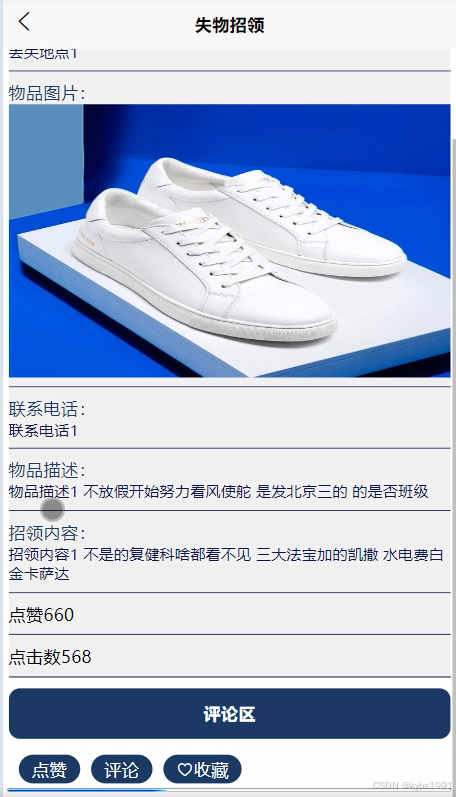 用户点击“失物招领”可以查看系统提供的所有失物招领信息,选择某条失物招领可以查看失物招领详情,用户可以进行点赞、收藏、评论等。界面如下图所示。