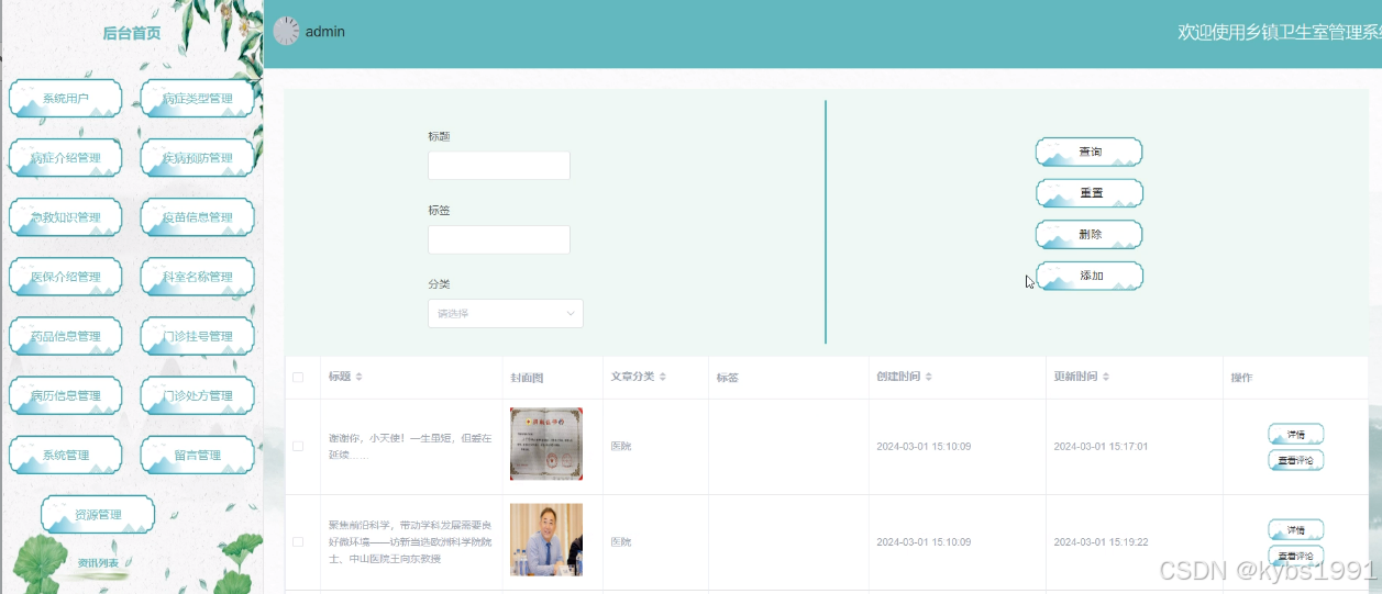 (5)资源管理:管理员可以对乡镇卫生室管理系统前台展示的医疗资讯以及资讯分类所属的分类进行管控。